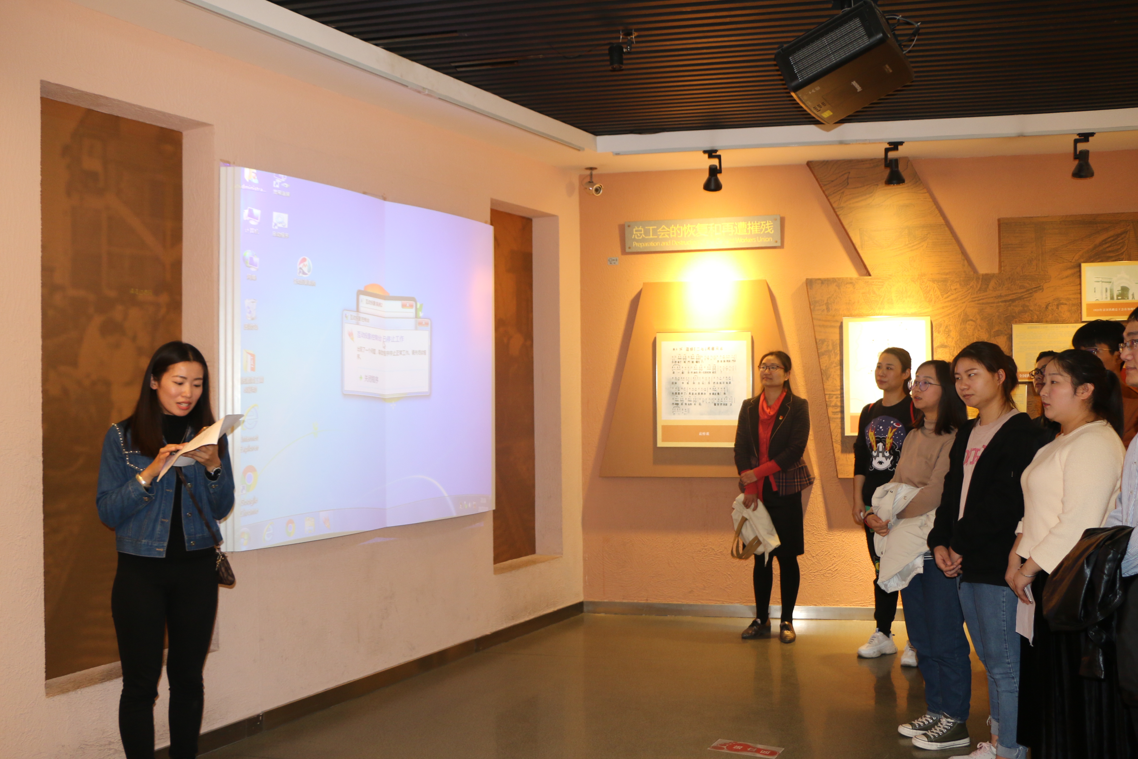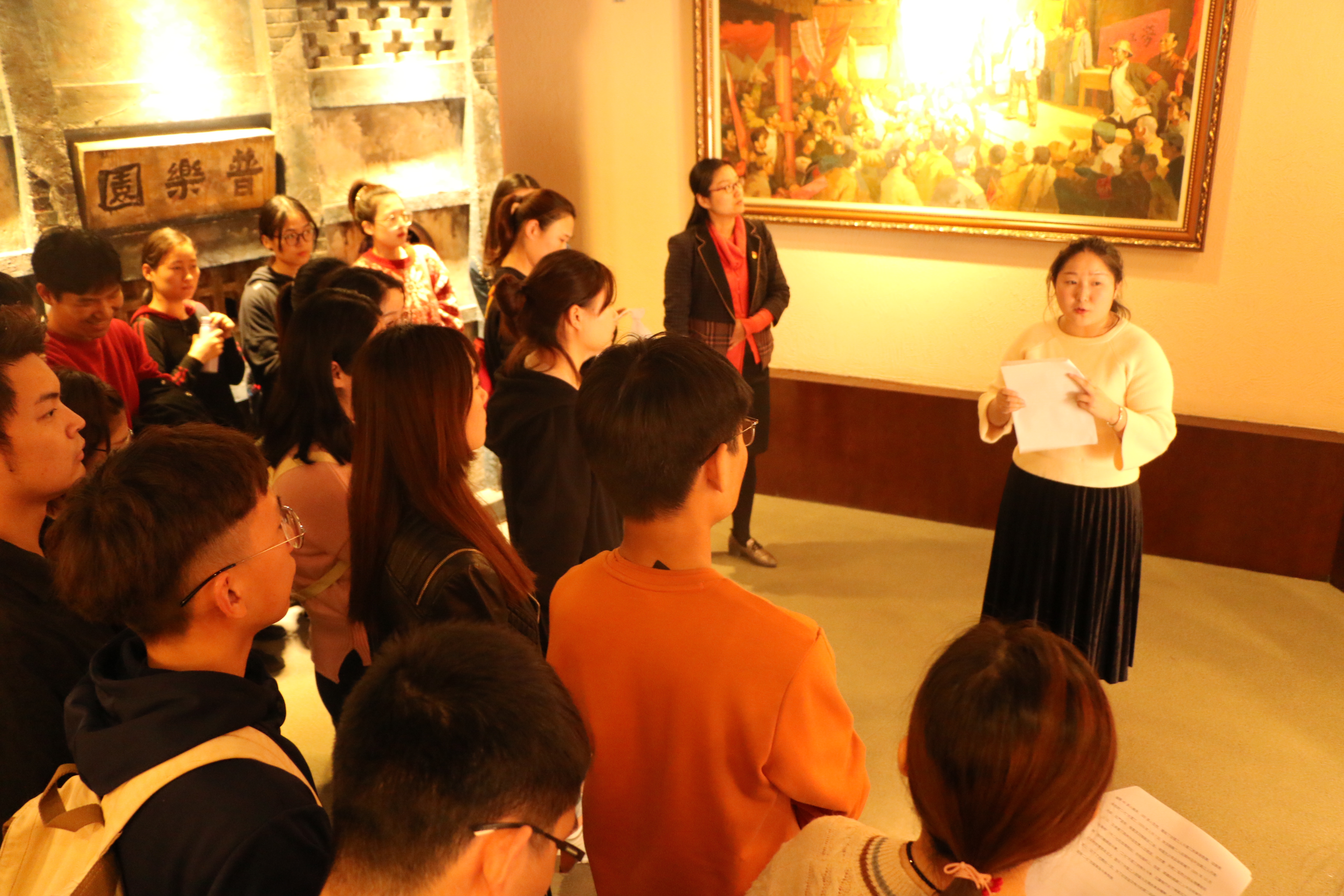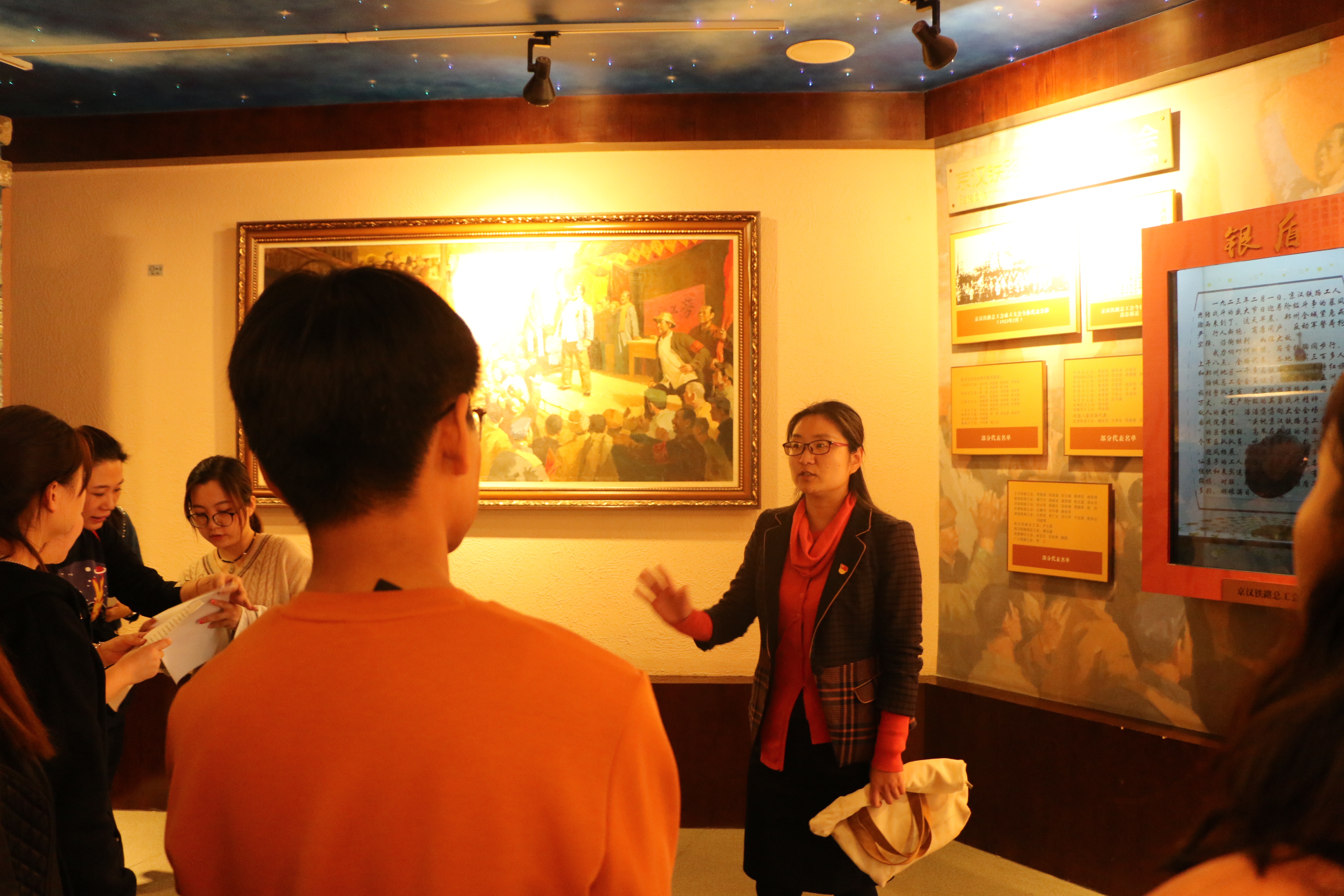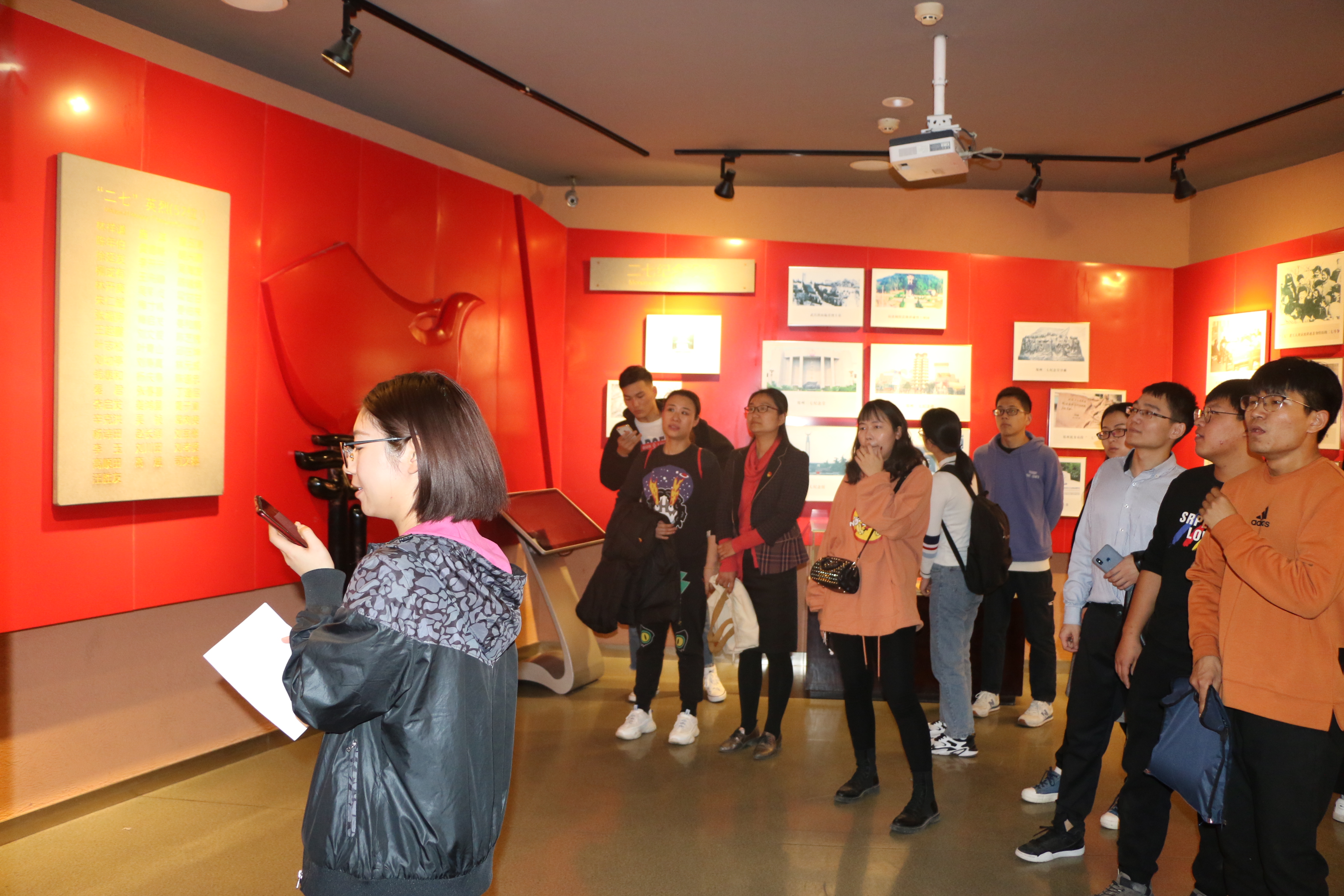 为了更好的进行学习,各个支部书记提前做好准备,查找历史资料,结合现场参观,自己做讲解员,为大家上一堂生动的党课。展厅内总共分为8个板块,分别是京汉铁路的修建与早期工人运动、京汉铁路总工会的成立、京汉铁路工人大罢工、工人运动的恢复和再遭摧毁、永恒的纪念、二七塔今昔、城市的记忆、继往开来。每个展厅都用一幅幅生动感人的图片及底蕴深厚的红色文物和平实的文字向我们展现一段段鲜活的历史。我们被塔内陈列的物品深深吸引,凝视着墙上悬挂着的一张张照片和文章,似乎看到了工人领袖林祥谦、施洋以及京汉铁路全线工人同仇敌忾、不怕牺牲,同反动派进行英勇顽强的斗争的画面。我们感受到了工人运动的脉搏,我们聆听到了被压迫的劳工的愤怒呐,我们内心震撼的感觉久久不能平复。