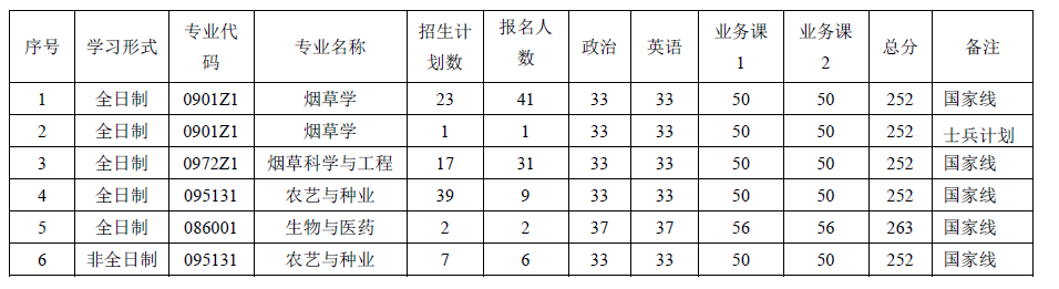 1、录取按照各专业排名从高到低依次录取,未被录取为学术型硕士的考生,征得考生意愿后,将调剂至农艺与种业领域烟草方向专业型硕士。