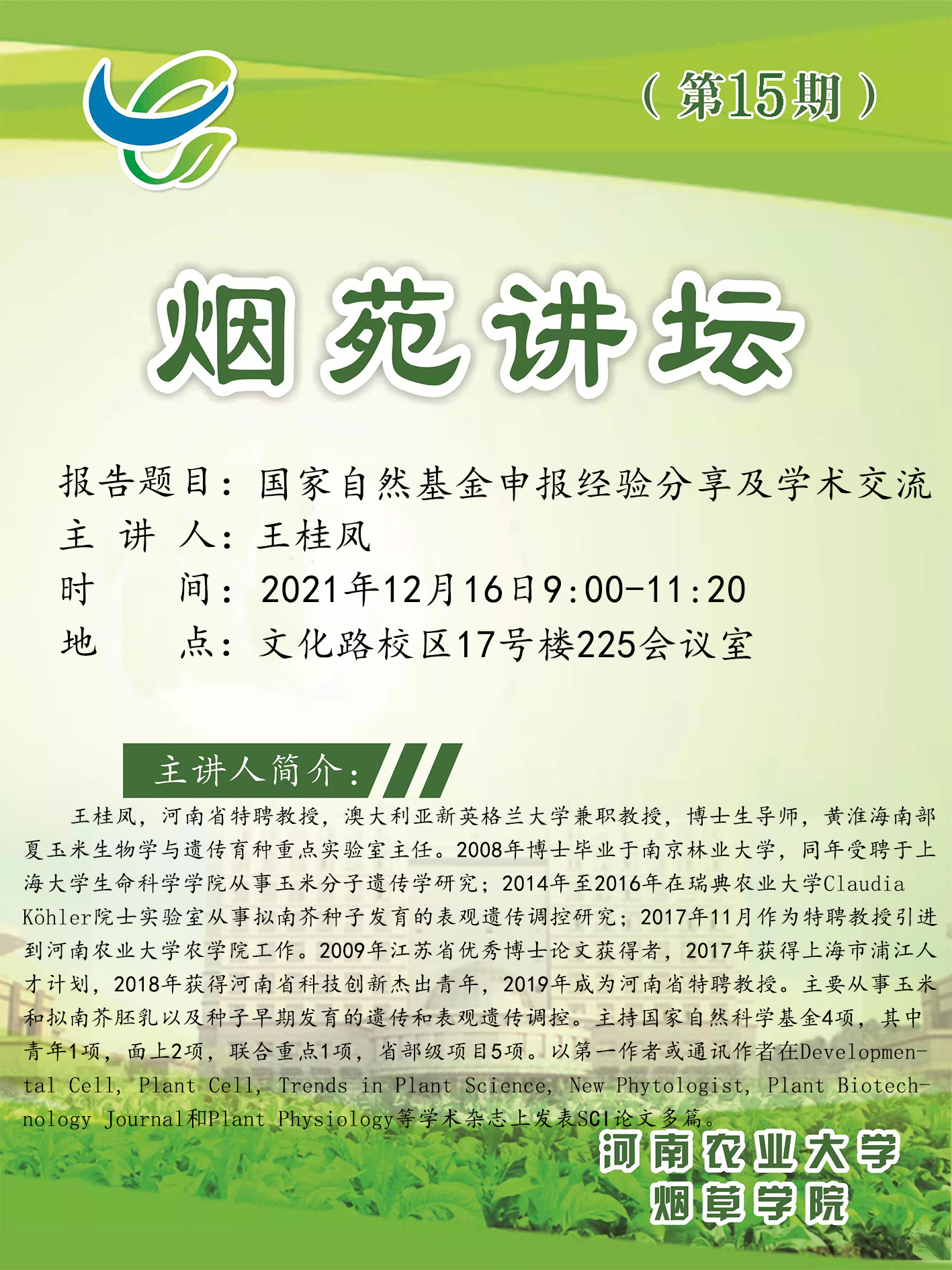 王桂凤,河南省特聘教授,澳大利亚新英格兰大学兼职教授,博士生导师,黄淮海南部夏玉米生物学与遗传育种重点实验室主任。2008年博士毕业于南京林业大学,同年受聘于上海大学生命科学云顶娱乐 从事玉米分子遗传学研究; 2014年至2016年在瑞典农业大学ClaudiaKohler院士实验室从事拟南芥种子发育的表观遗传调控研究; 2017年11月作为特聘教授引进到云顶娱乐 农云顶娱乐 工作。2009年江苏省优秀博士论文获得者,2017年获得上海市浦江人才计划,2018年获得河南省科技创新杰出青年,2019年成为河南省特聘教授。主要从事玉米和拟南芥胚乳以及种子早期发育的遗传和表观遗传调控。主持国家自然科学基金4项,其中青年1项,面上2项,联合重点1项,省部级项目5项。以第一作者或通讯作者在Developmental Cell, Plant Cell, Trends in Plant Science, New Phytologist, Plant Biotech-nology Journal和Plant Physiology等学术 杂志上发表SC1论文多篇。