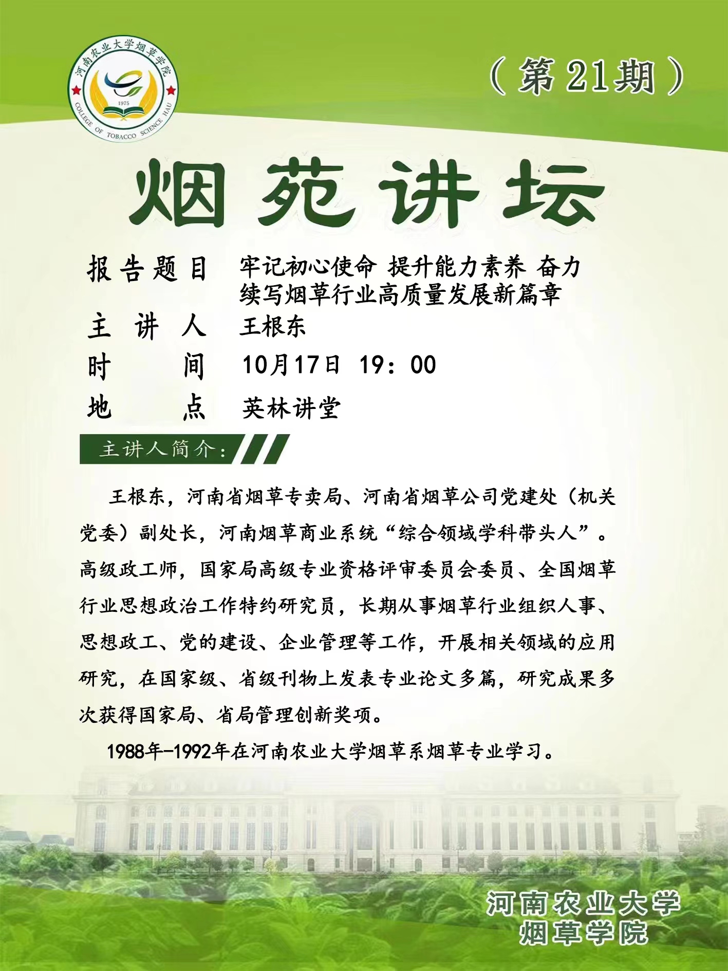 报告题目:牢记初心使命 提升能力素养 奋力续写烟草行业高质量发展新篇章