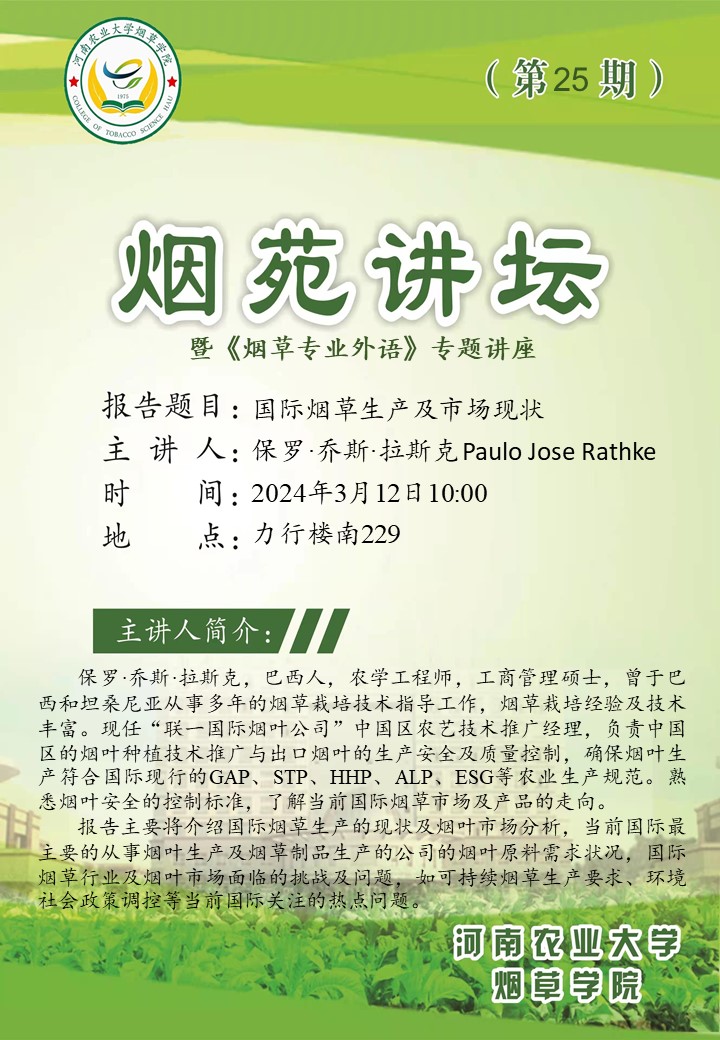 保罗·乔斯·拉斯克,巴西人,农学工程师,工商管理硕士,曾于巴西和坦桑尼亚从事多年的烟草栽培技术指导工作,烟草栽培经验及技术丰富。现任“联一国际烟叶公司”中国区农艺技术推广经理,负责中国区的烟叶种植技术推广与出口烟叶的生产安全及质量控制,确保烟叶生产符合国际现行的GAP、STP、HHP、ALP、ESG等农业生产规范。熟悉烟叶安全的控制标准,了解当前国际烟草市场及产品的走向。