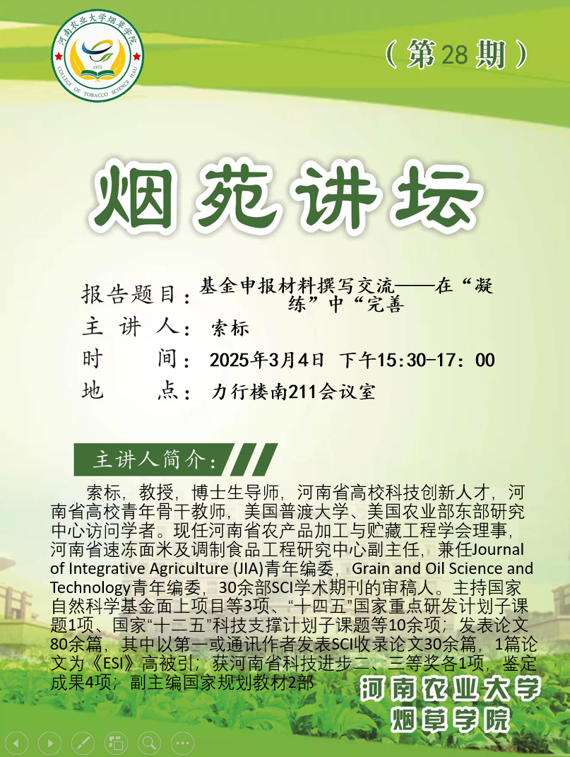 索标,教授,博士生导师,河南省高校科技创新人才,河南省高校青年骨干教师,美国普渡大学、美国农业部东部研究中心访问学者。现任河南省农产品加工与贮藏工程学会理事,河南省速冻面米及调制食品工程研究中心副主任,兼任Journal of Integrative Agriculture (JIA)青年编委,Grain and Oil Science and Technology青年编委,30余部SCI学术期刊的审稿人。