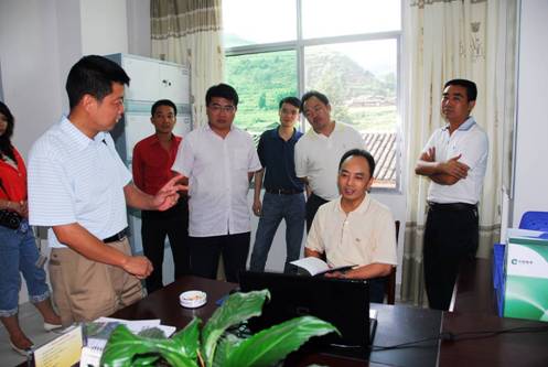 叶协锋老师向崔建华副总经理一行介绍有关情况。右2为川渝中烟物资供应中心胡晓明主任,右3为川渝中烟崔建华副总经理,右5为川渝中烟基地办刘朝科主任,右7为凉山州烟草专卖局(公司)宋俊局长(经理)。)