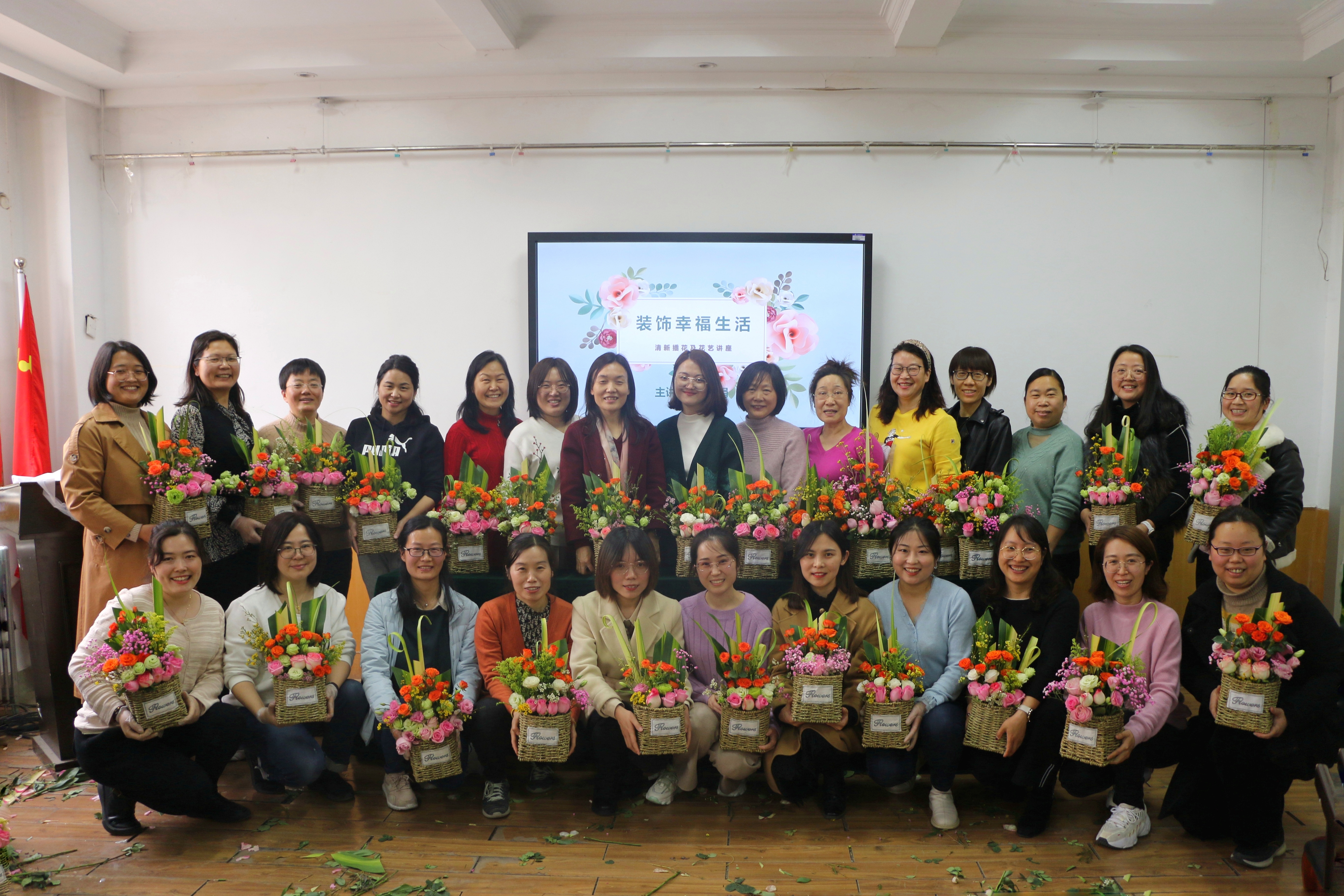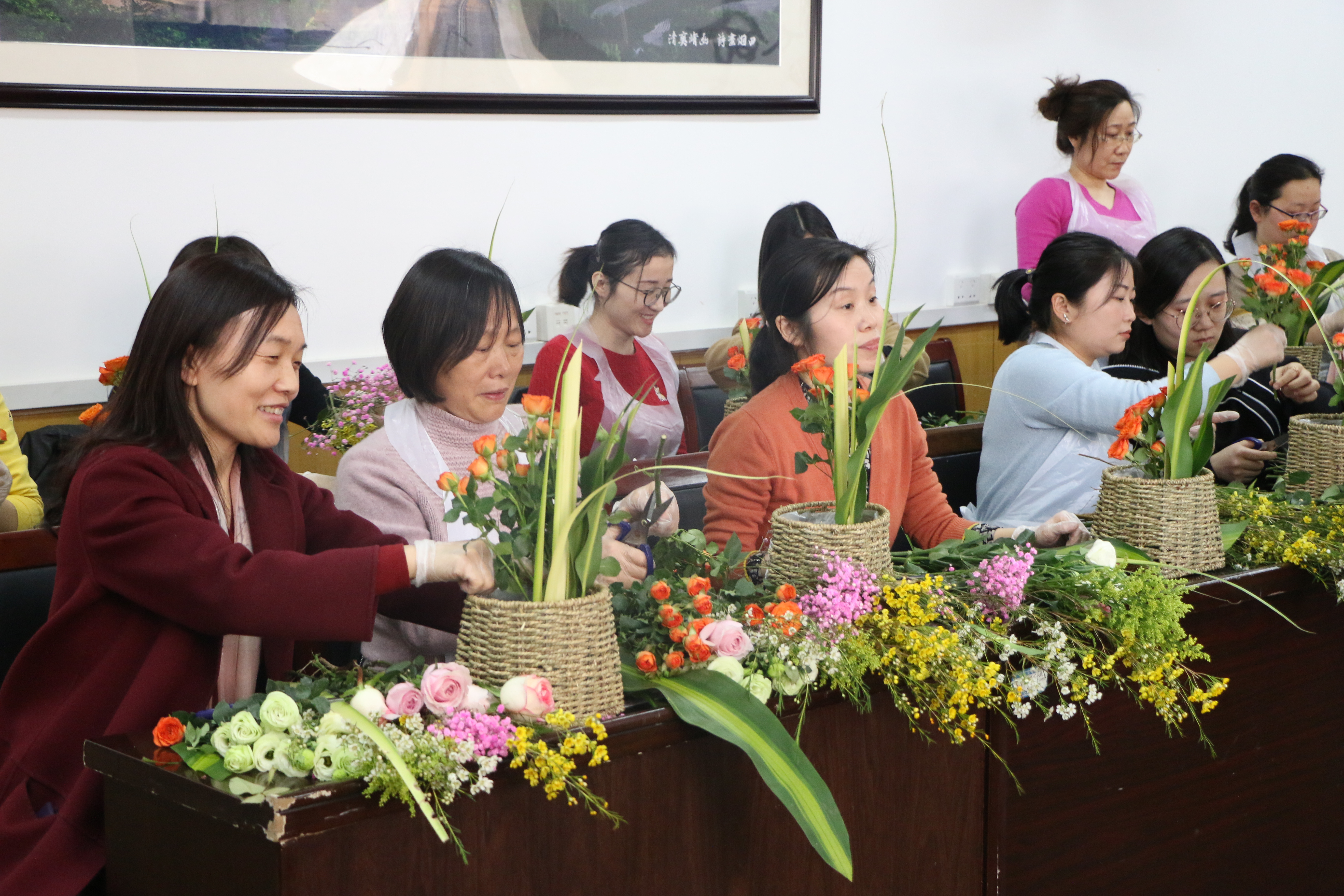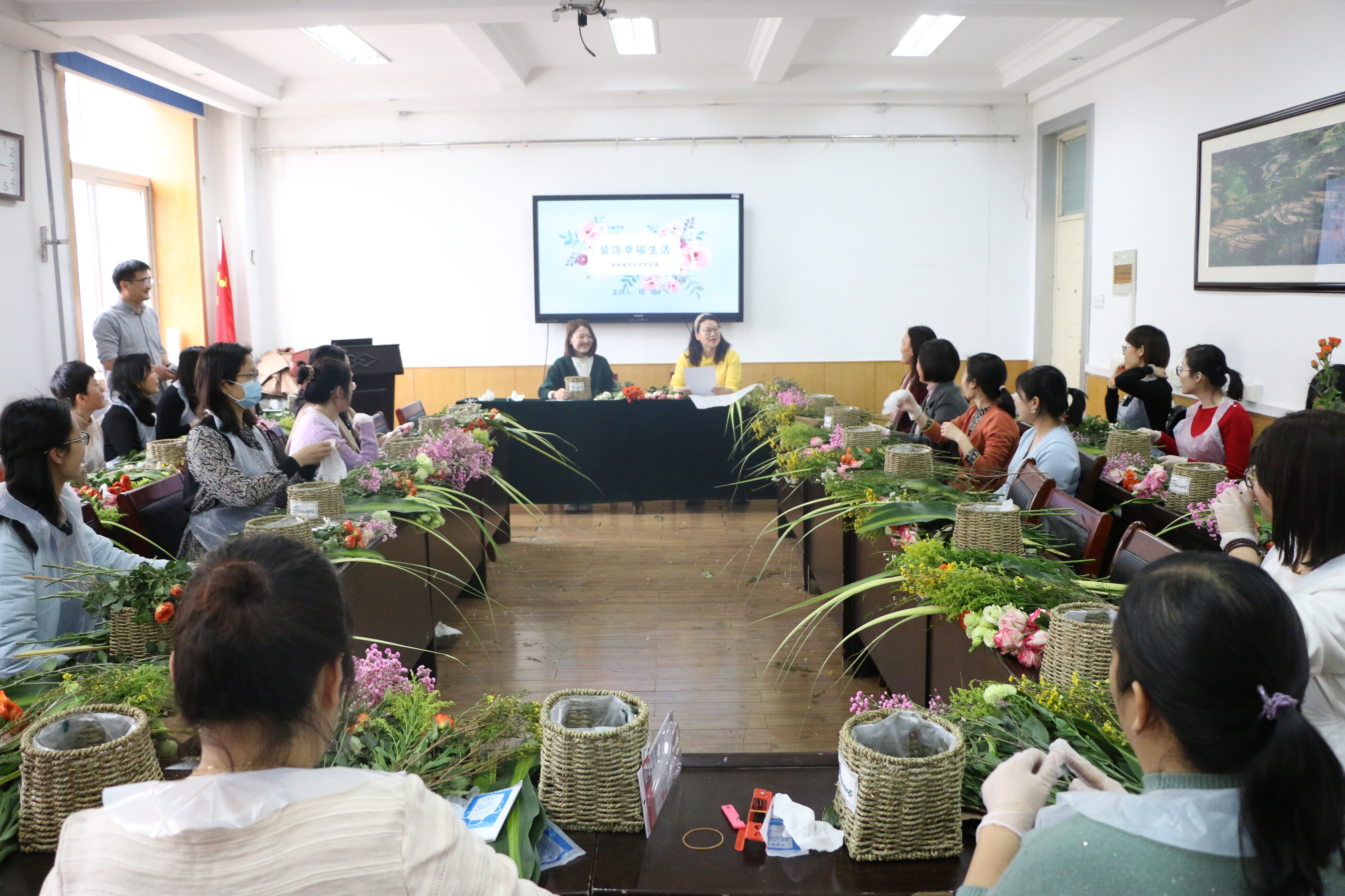 杨娟详细讲解了插花的花材花器、构图布局、色彩搭配等基本知识,现场传授插花技巧手法。在杨娟的指导下,各位女教师一边相互交流插花心得,一边仔细对花枝进行修整,精心搭配,设计出各具特色的插花作品。活动现场气氛温馨融洽,处处洋溢着浓浓花香和老师们的欢声笑语。