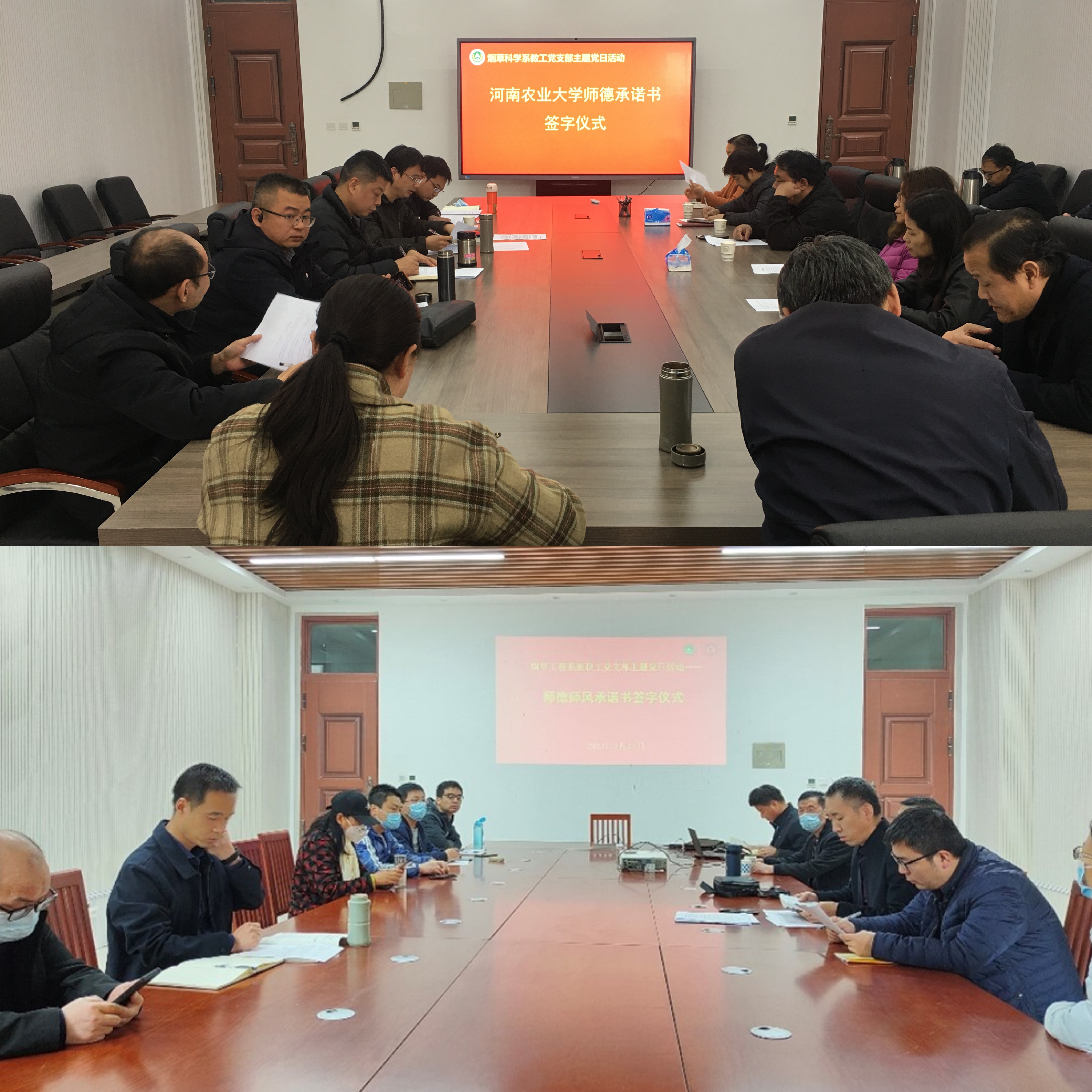 会上,大家集体学习了习近平总书记关于师德师风的重要论述、云顶娱乐 下发的师德师风有关文件精神、师德承诺书中的承诺事项,重点学习了“学习强国”中师德师风特别节目——《榜样力量》和近年来高校教师违反师德师风典型案例,这些典型案例包括:违背党的路线方针政策,散布不当言论,科研中弄虚作假、抄袭剽窃等,在招生考试中徇私舞弊,对学生实施性骚扰或与学生发生不正当关系等10大类,共20余个典型案例。集中学习后,烟草科学系和烟草工程系全体教师逐一上台,在其他教师见证下签下自己的姓名、做出郑重承诺。