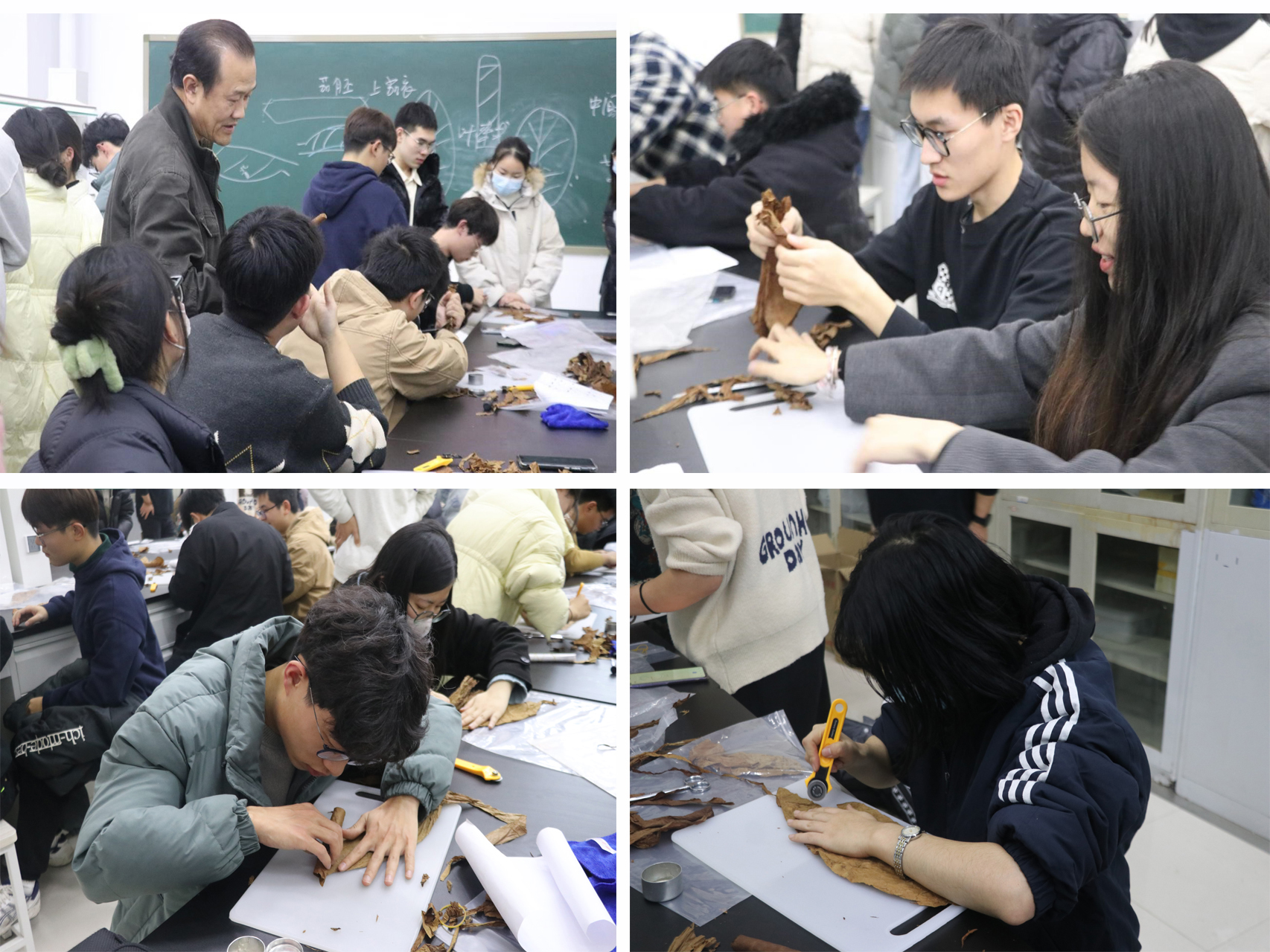 经过同学们组队报名,雪茄实验室筛选,此次比赛共有本科生和研究生25支队伍参加。赛前,时向东向大家讲解了雪茄烟产业发展情况、雪茄卷制的基本方法和技巧,并完整展示了雪茄卷制的全过程。比赛中,时向东对参赛选手进行了耐心指导和点评,各小组成员从茄芯的准备到茄套的定型,再到茄衣的处理,都分工合理,配合默契。即使是雪茄卷制零基础的参赛小组,也都按照讲解的操作完成了比赛。