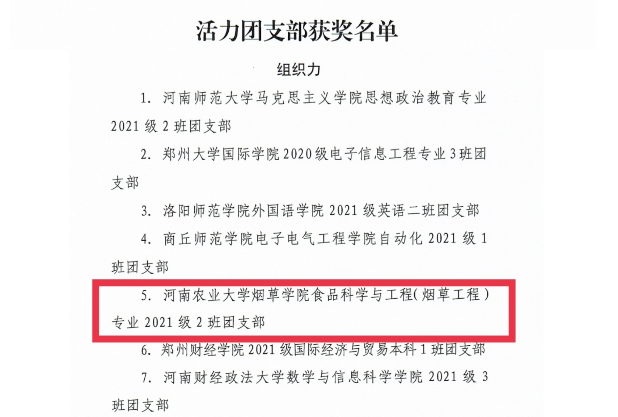 获得多项荣誉:院团委书记王雪婧《接青春之火 续百年荣光》微团课荣获三等奖、食品科学与工程(烟草工程)专业2021级2班团支部荣获“活力团支部”称号。