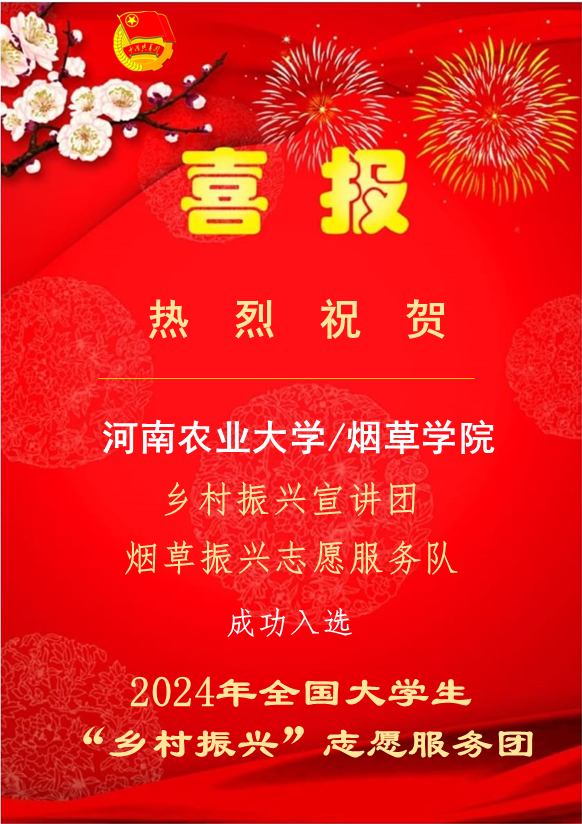 2023年3月5日,习近平总书记在参加十四届全国人大一次会议江苏代表团审议时强调,要把产业振兴作为乡村振兴的重中之重,积极延伸和拓展农业产业链,培育发展农村新产业新业态,不断拓宽农民增收致富渠道。为深入学习贯彻习近平新时代中国特色社会主义思想和党的二十大精神,落实“强国复兴有我”群众性主题宣传教育活动相关要求,服务全面推进乡村振兴,动员引导青年学生投身乡村振兴一线,中国农业发展银行、团中央青年志愿者行动指导中心联合发布了《关于遴选2024年全国大学生“乡村振兴”志愿服务团的公告》。云顶娱乐 “烟草振兴志愿服务队”入选2024年全国大学生“乡村振兴”志愿服务团,也是云顶娱乐 唯一一支入选团队。