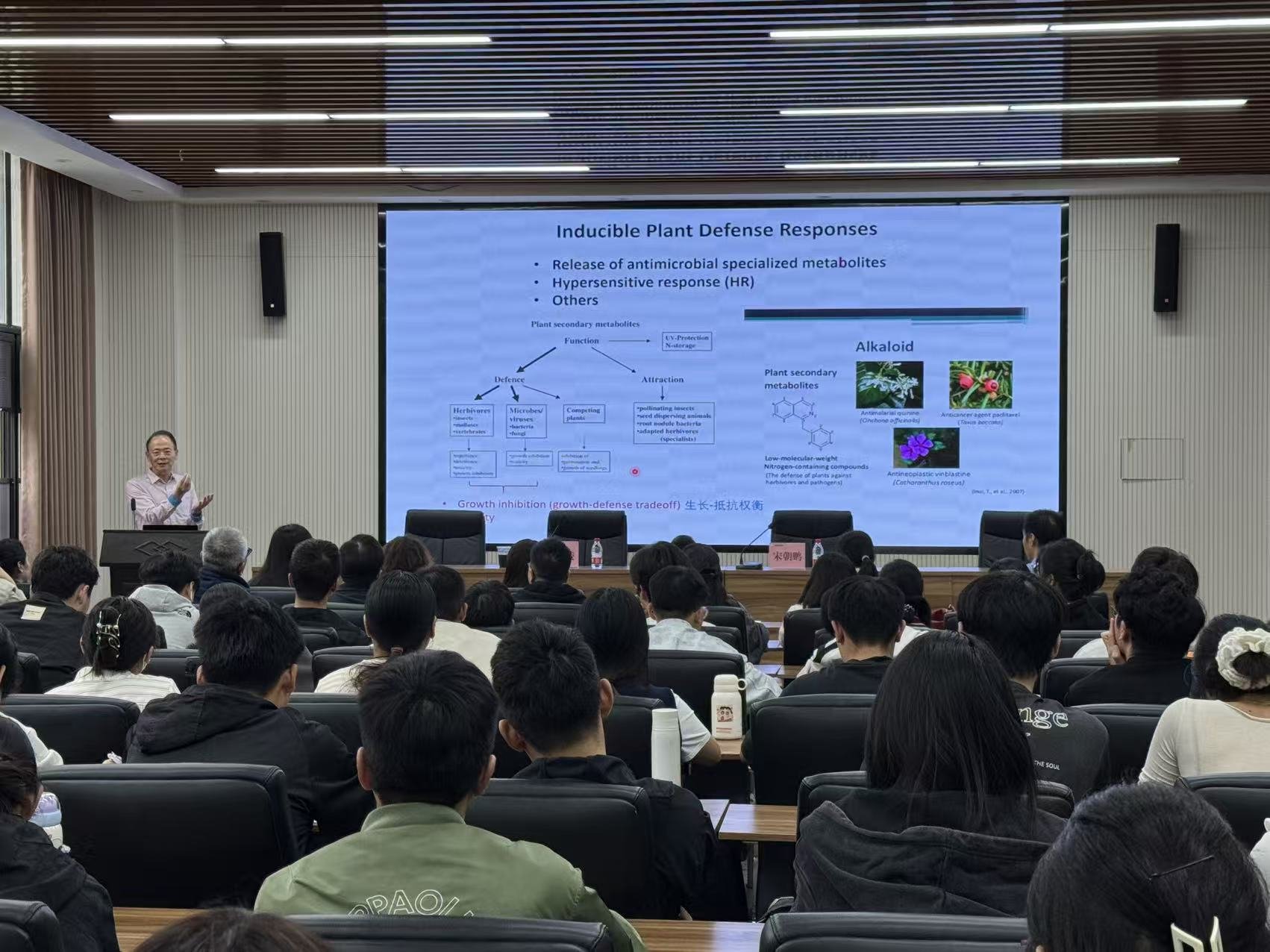 同日下午,袁教授为全院师生作题为《一个复杂代谢途径如何在抵御病原体与害虫方面表现出差异性》的学术报告。报告以长春花为研究材料,系统介绍了其团队在植物代谢调控与抗逆机制方面的最新进展。袁教授用生动的语言和清晰的逻辑,阐释了不同胁迫条件下特定激酶与转录因子如何通过多层次调控影响植物生物碱合成,并强调翻译后修饰在其中发挥的关键作用。他指出,烟碱在植物体内可能存在类似的调控机制,为烟草及其他作物的抗性研究提供了重要参考。
