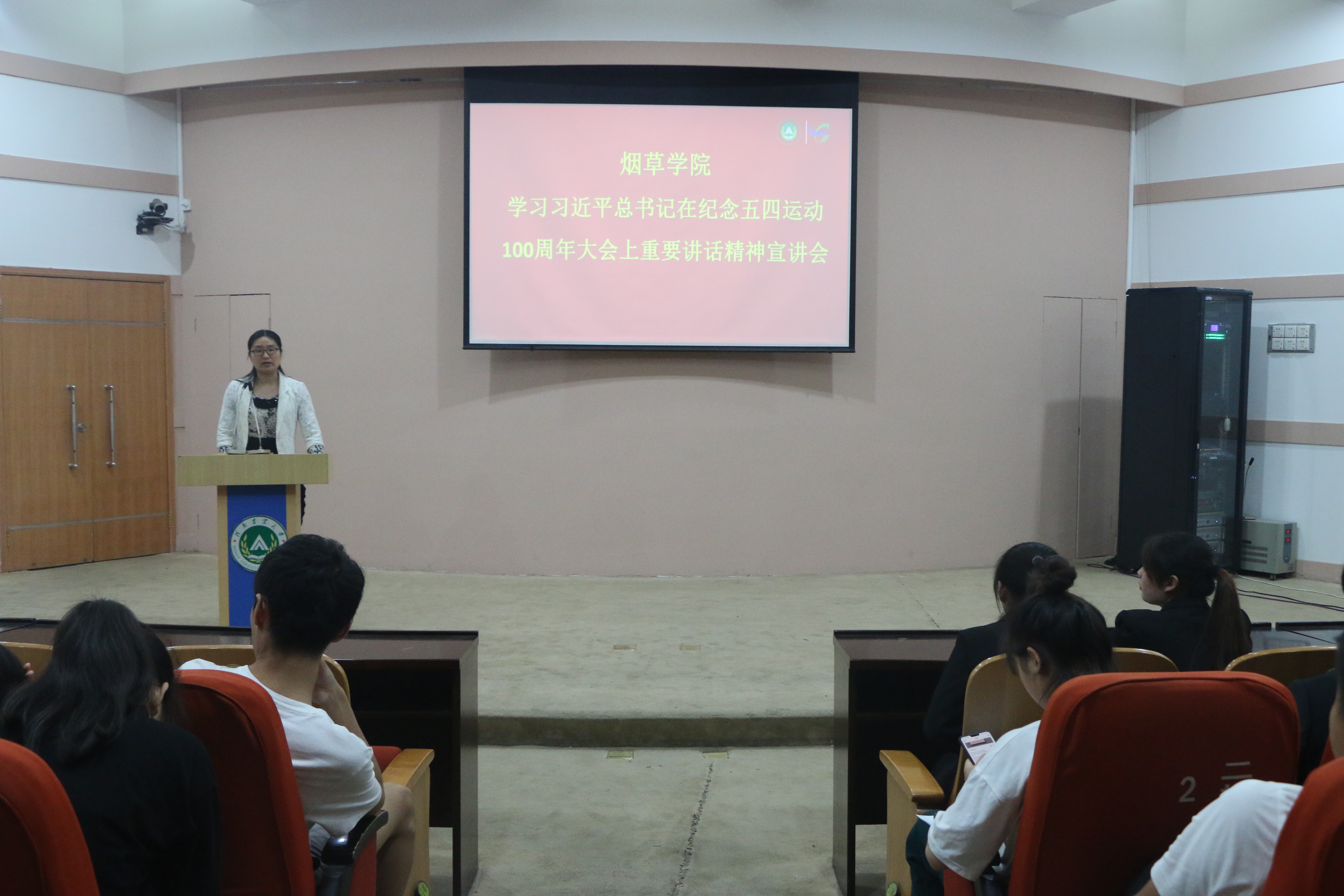 于300人报告厅举办“学习习近平总书记在纪念五四运动100周年大会上重要讲话精神”宣讲活动,院党委副书记秦素玲主讲,17、18级学生代表参加。