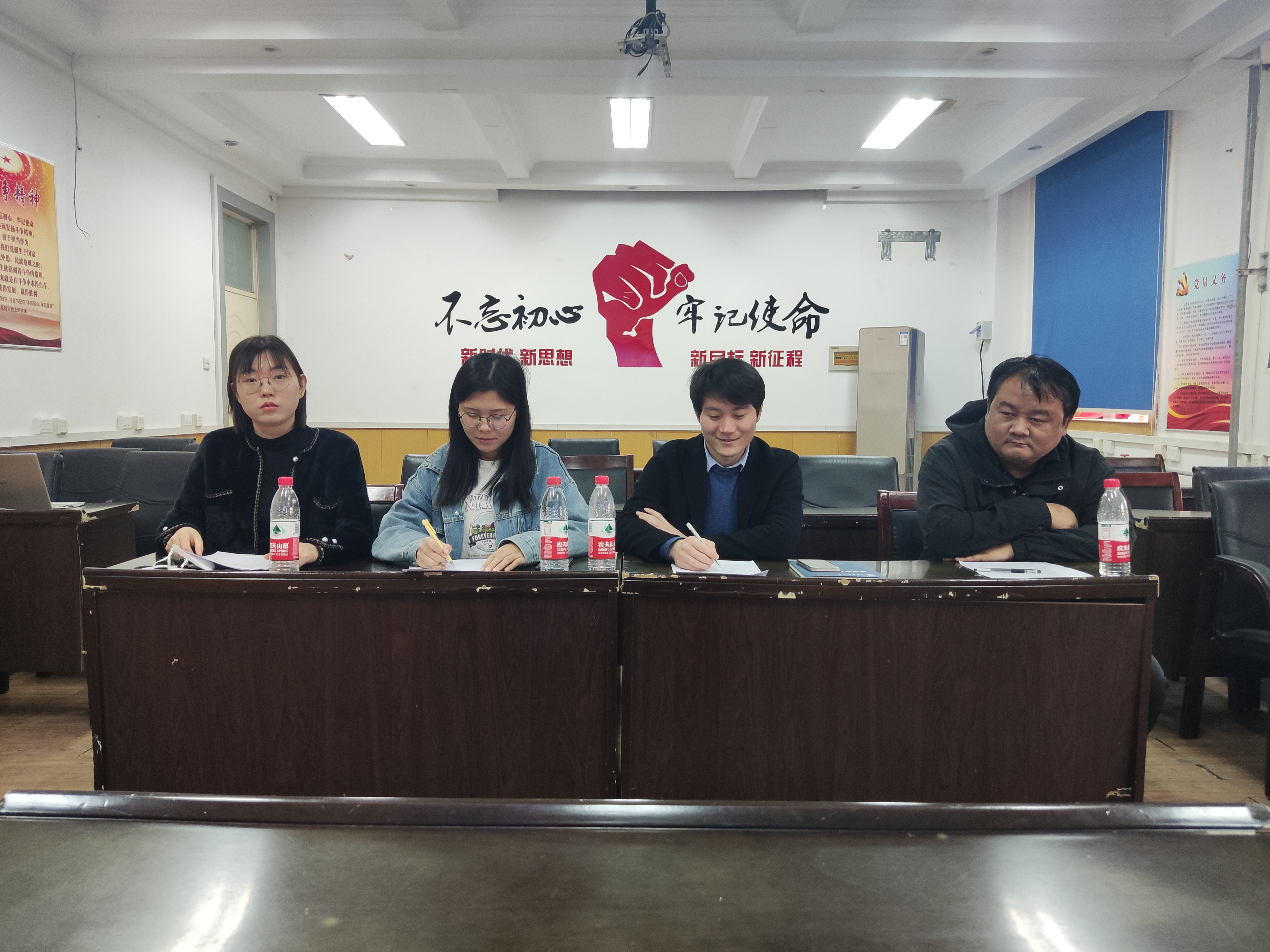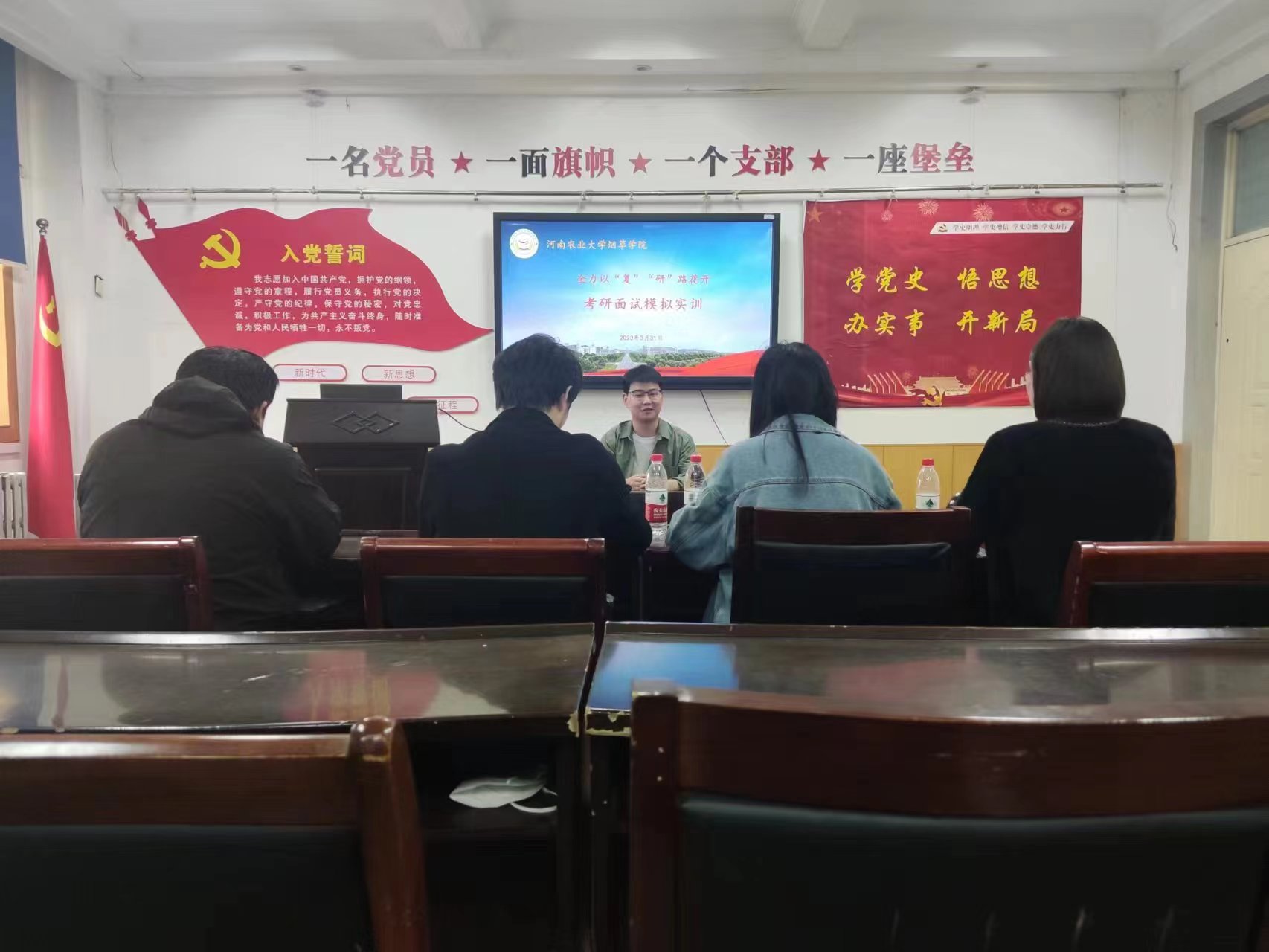 于文化路校区17号楼225举办了2023届毕业生考研面试模拟实训,党炳俊、路绪良、崔静宇、胡旦旦四位老师担任评委,50名2023届毕业生参加了本次实训。活动由辅导员胡旦旦主持。
