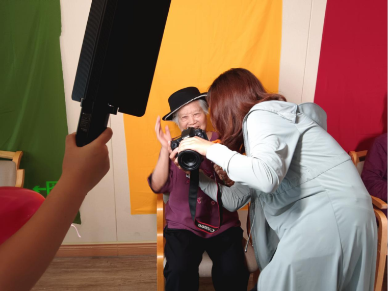 活动中,实践队在养老院活动室搭建了“多彩摄影棚”——以绚丽彩幕作背景,用专业灯光营造温馨氛围。拍摄时,与“岁月讲述者”积极互动,与队伍里的退役士兵和退伍老人聊聊服役片段;为老人别上缀着“好孩子”字样的大红花。面对行动不便的老人,队员们则是携带设备穿梭在楼层间,举起幕布当移动背景,在床边、轮椅旁捕捉鲜活瞬间。给卧床的爷爷奶奶拍摄时,队员在举着补光灯调整角度的同时,也陪老人唠起年轻时的韶华。