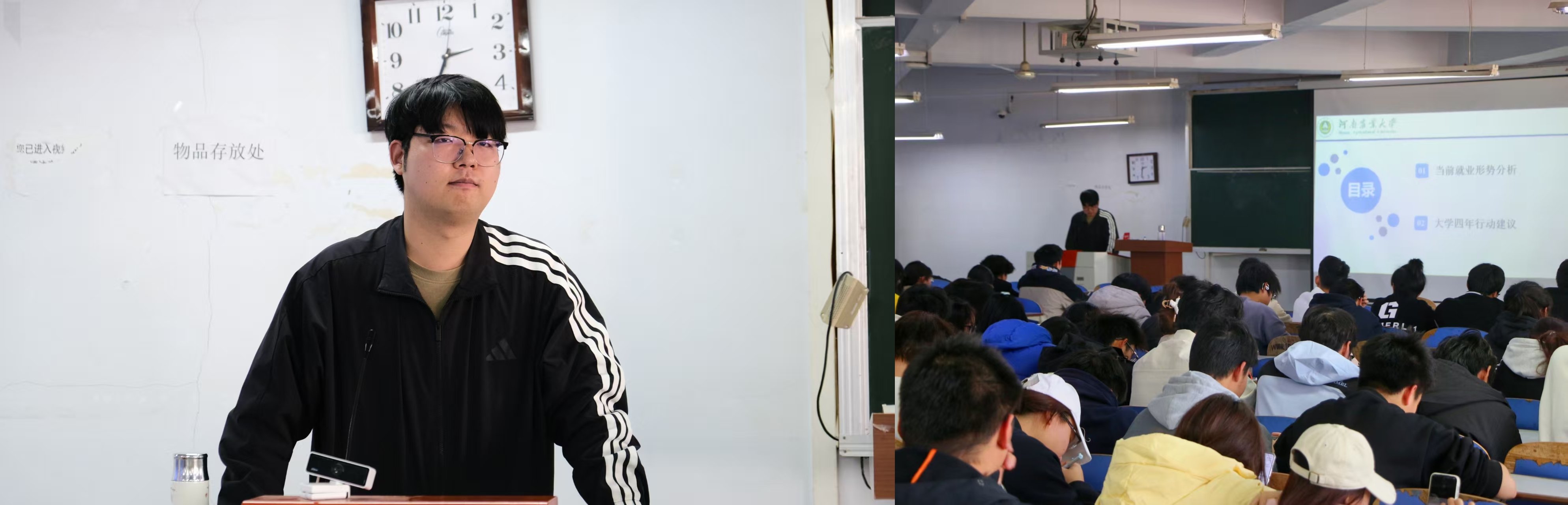 随后,滕环瑜分享了关于大学生职业规划大赛的实战经验。他围绕大赛成长赛道与就业赛道两大方向的核心区别,从比赛环节、评审标准、赛事收获等方面展开讲解,重点强调了岗位胜任力在评审过程中的关键作用。结合自身备赛心得,他详细介绍了职业规划PPT与简历的制作技巧,从封面设计、目录架构、岗位分析、就业准备、发展潜力等板块的内容要点,逐一进行拆解说明,为新生提供了可操作的实践方案。此外,他还分享了路演答辩的准备方法,鼓励大家在竞赛中锻炼综合能力,在试错中明确短板、积累经验。