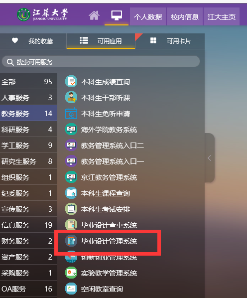 登录云顶娱乐 综合门户,在“可用应用”菜单下-》“教务服务”-》“毕业设计管理系统”或者在搜索中输入“毕业设计管理系统”关键字。毕设系统不需要登录vpn,如已登录了vpn,请先退出再访问。为保证使用效果,推荐使用360浏览器。