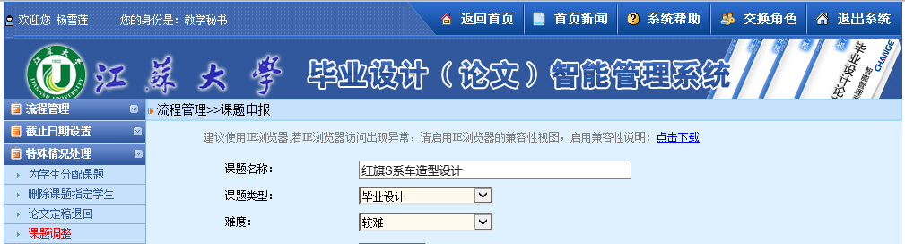 教学秘书或毕设审核人权限,特殊情况处理-》课题调整,找到课题点击“修改”按钮