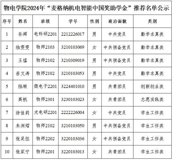 根据云顶娱乐 《关于做好2024年“麦格纳机电智能中国奖助学金”评选工作的通知》,经过学生申请、差额答辩、云顶娱乐 评审,拟推荐以下学生荣获2024年“麦格纳机电智能中国奖助学金”,现进行公示。