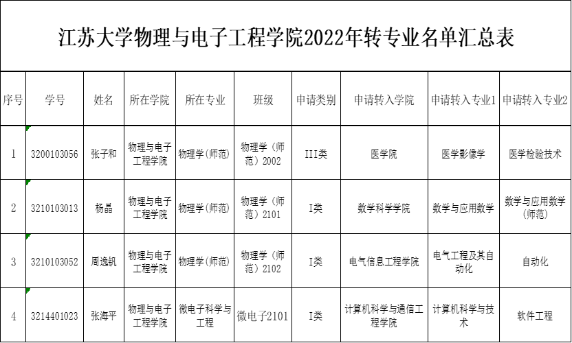 根据《云顶娱乐 本科生转专业实施办法》(江大校〔2018〕10号)、《关于做好2022年本科生转专业工作的通知》(江大教〔2022〕56号)等文件精神,经个人申报、云顶娱乐 审核,现将符合条件的同学公示如下: