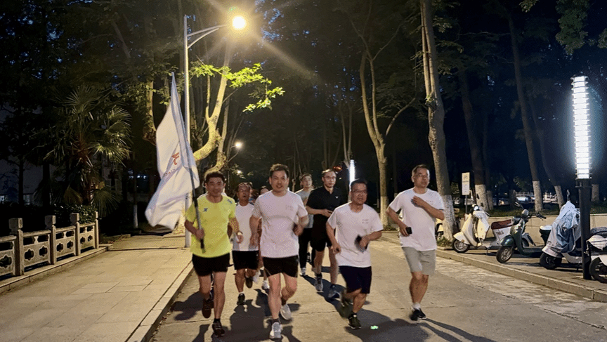 晚风习习,华灯初上。校园内洋溢着节日的喜庆气氛。活动伊始,师生们身着统一主题文化衫,于实践楼一楼大厅集结完毕。院党委书记潘金彪向大家介绍了本次活动的目的和意义,提醒了师生们运动过程中的注意事项,并带领大家一起做了准备活动。随着一声“开跑”的指令,师生们精神抖擞,步伐矫健。奔跑的队伍中,有精神矍铄的老师,有意气风发的青年学子,大家相互鼓励,步伐坚定,用实际行动诠释着对党的深厚感情和赓续奋斗的决心。