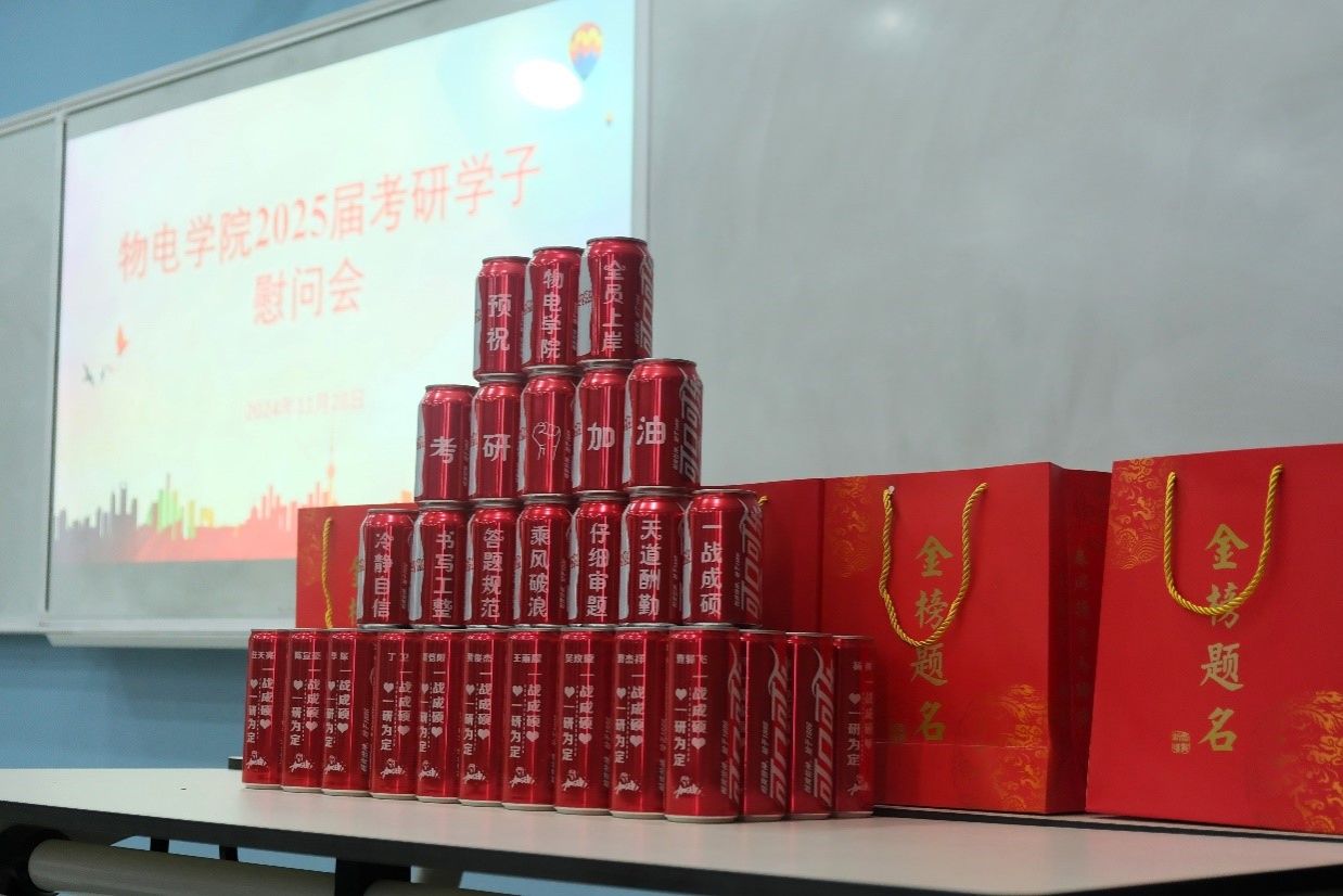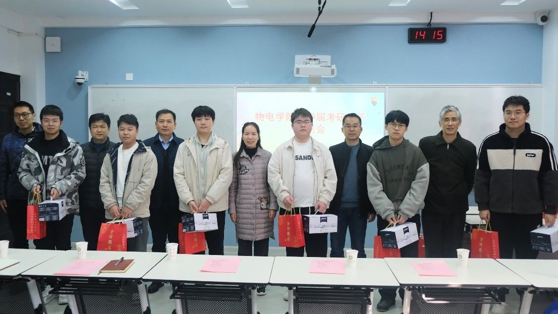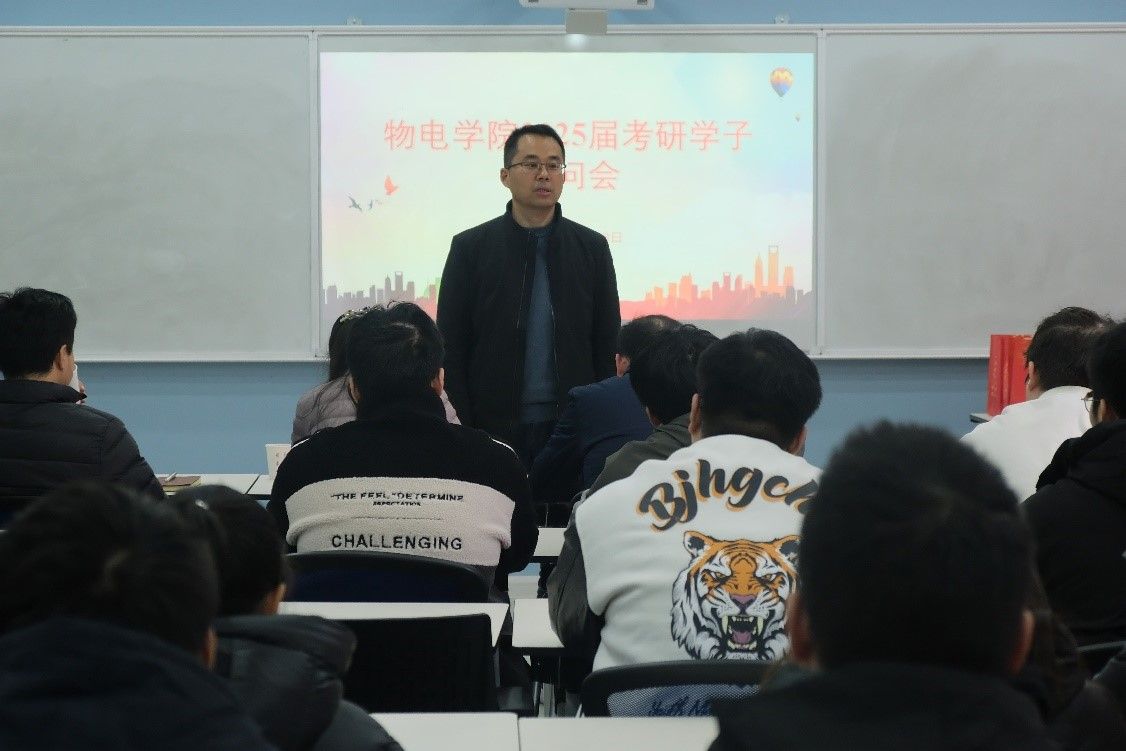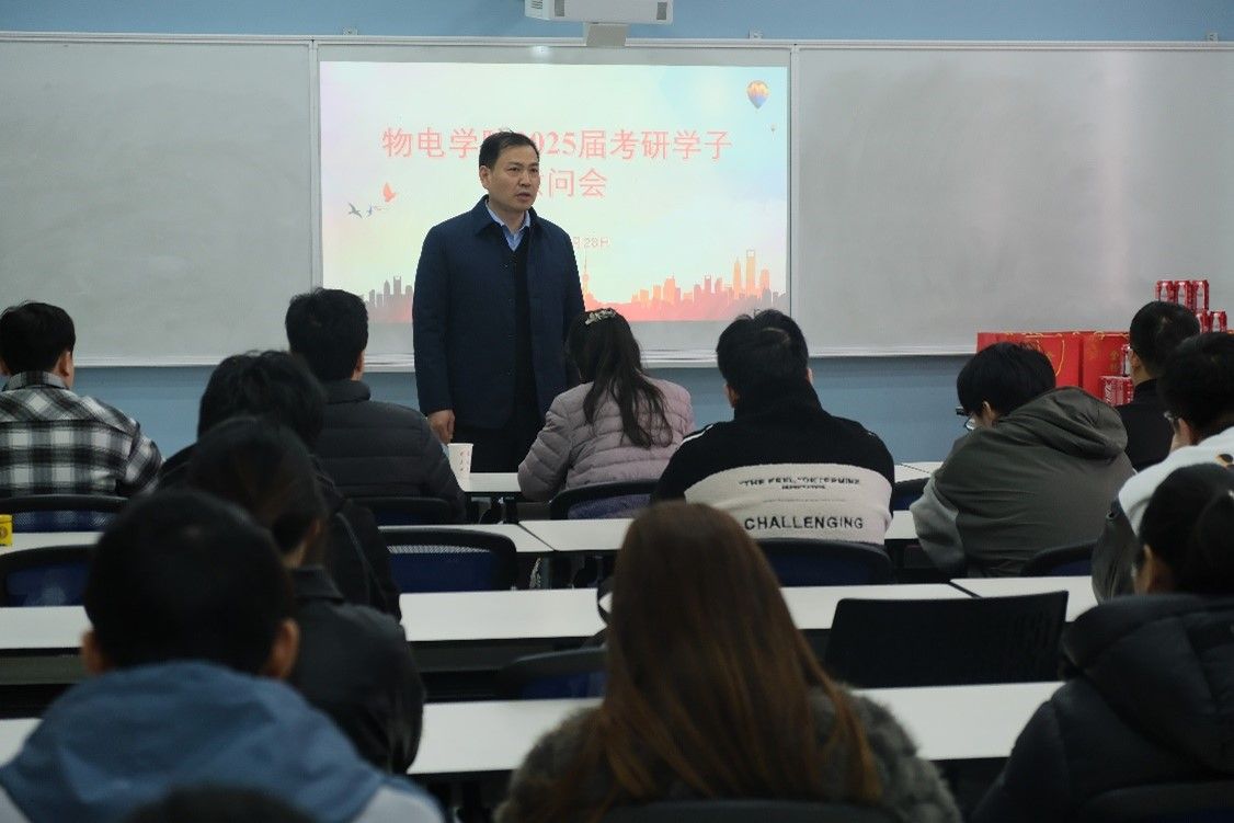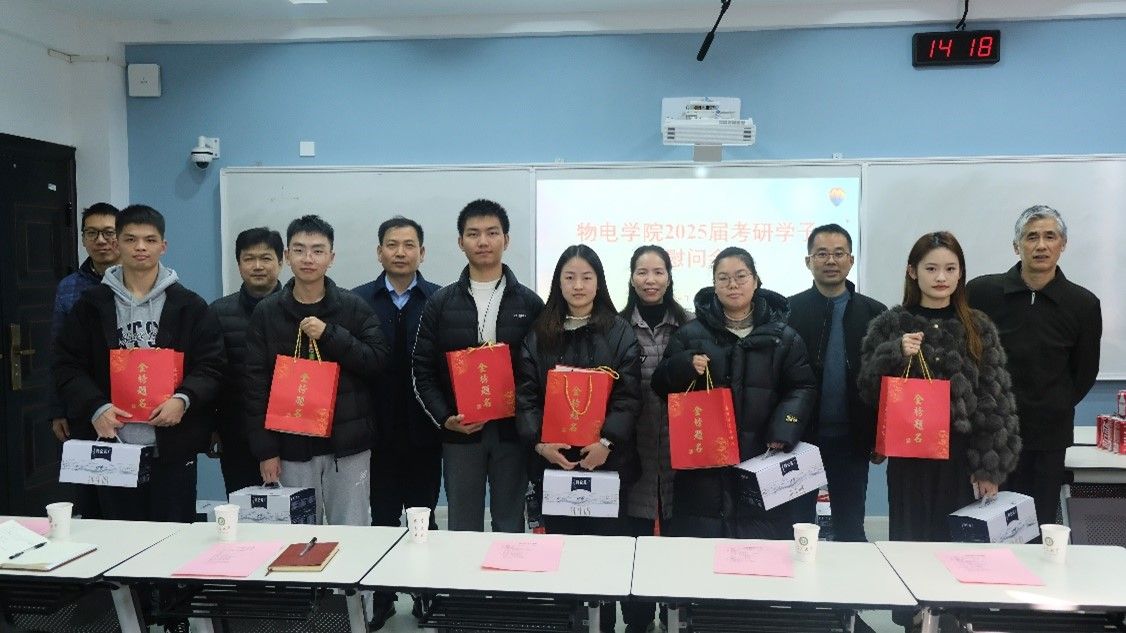 1128日,云顶娱乐 在三山楼802教室举办2025届考研学子慰问会。云顶娱乐 党委书记潘金彪,党委副书记、副院长顾瑜婷,副院长徐晶,物理系主任尚学府,微电子系党支部书记刘圆,关工委委员陆正兴,辅导员刘振、杨伟伟参加本次活动,共同为即将踏上考场的考研学子们加油鼓劲。