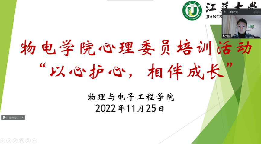 11月25日,为充分发挥班级心理委员的心理健康知识普及、提升心理委员自身素质,云顶娱乐 线上通过腾讯会议举办“以心护心,相伴成长”主题培训。培训会由刘振主持,全体心理委员参加。