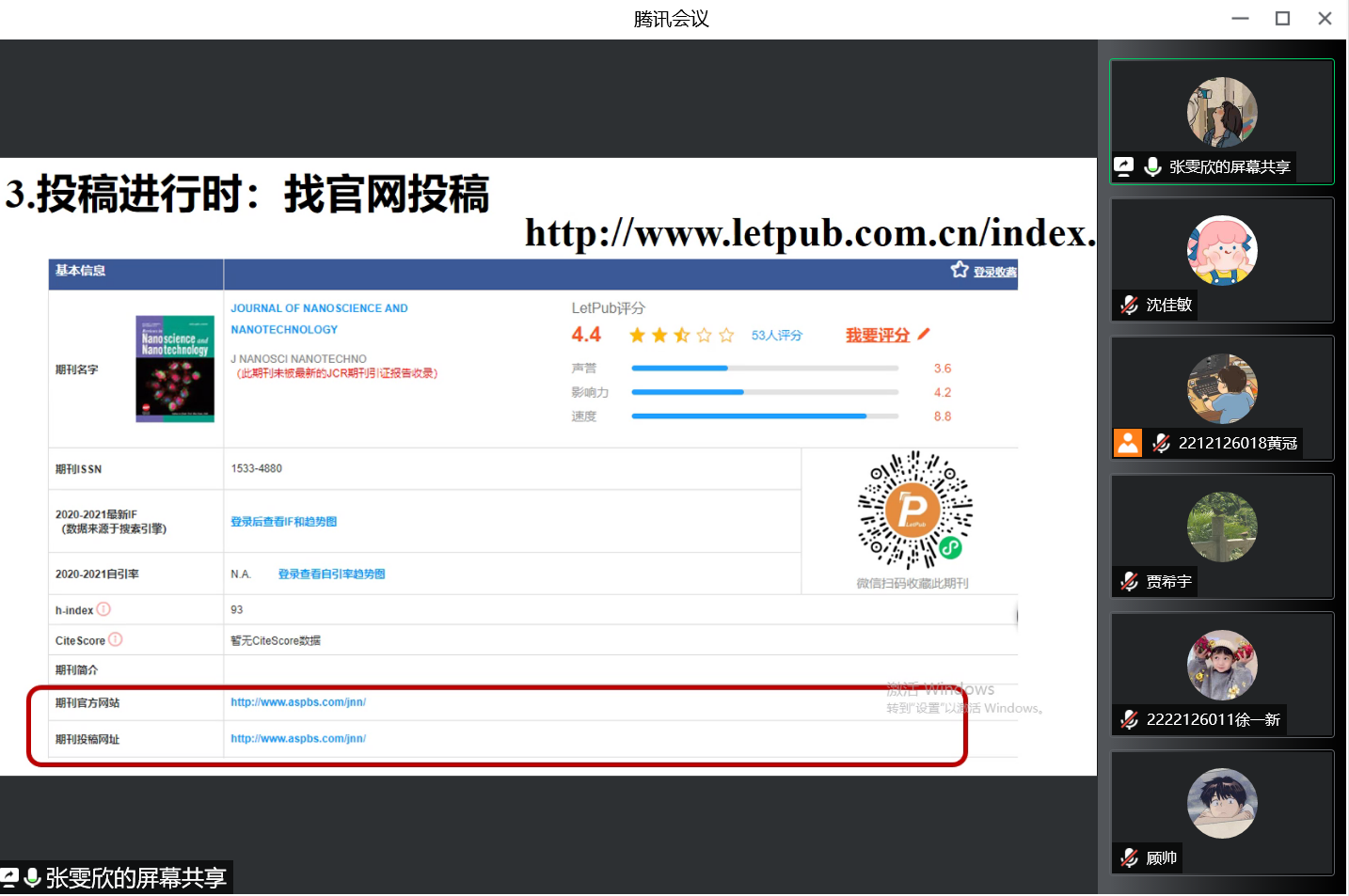 5月24日,为促进优秀科研成果交流,创造研究生学术交流机会,云顶娱乐 研究生会举办了线上SCI投稿学习交流会。此次交流会邀请了优秀研究生代表薛双双、张雯欣同学,由院研会学术部主持。