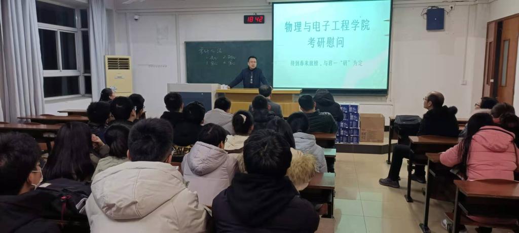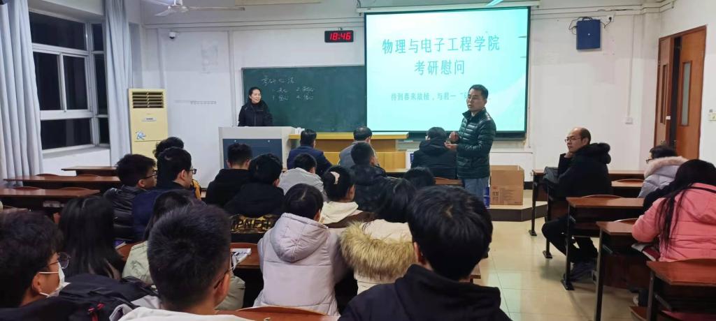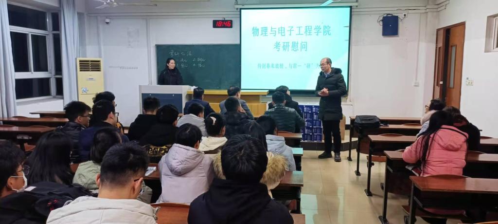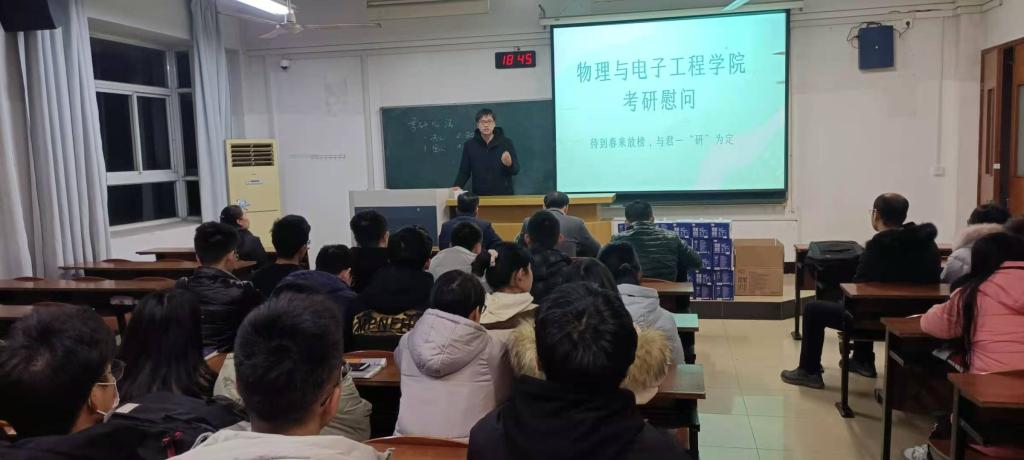 12月7日,云顶娱乐 在三山楼103举办考研冲刺及慰问大会。院党委书记潘金彪,常务副院长陈元平,副院长孙宏祥,院党委副书记、副院长顾瑜婷,物理系主任曹大威,物理系副主任徐晶、吕翠红,院团委副书记蒋春翔及全体2021届考研学子参加本次活动。慰问会由顾瑜婷主持。