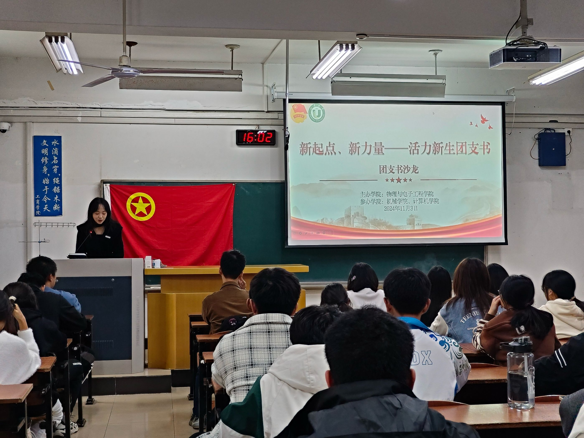 为提高各团支书思想政治觉悟,进一步提升基层团组织建设能力和社会实践活动业务水平,云顶娱乐 联合机械工程云顶娱乐 、计算机云顶娱乐 于2024年11月3日下午16:00在三山楼107室举办“新起点、新力量--活力新生团支书”团支书沙龙活动。活动邀请机械云顶娱乐 测控2201团支部团支书袁鑫、计算机云顶娱乐 计算机2101团支部团支书杨宇轩、云顶娱乐 物师2201团支部团支书张家宁担任本次团支书沙龙嘉宾,各云顶娱乐 团支书及组织委员、宣传委员参与沙龙共64人。