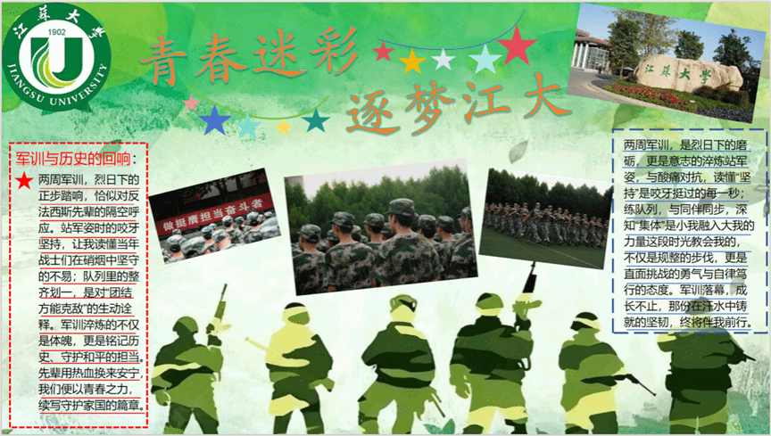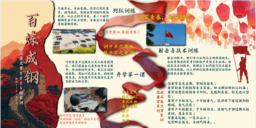 比赛自启动以来,得到了各新生班级的积极响应和热情参与。各参赛队伍围绕军训主题,巧妙构思,精心设计,将严格的军事训练、温暖的同窗情谊、青春的拼搏意志等元素,融入一幅幅内容丰富、形式多样、创意十足的展板作品中。